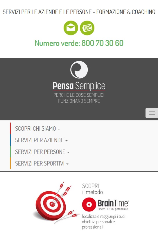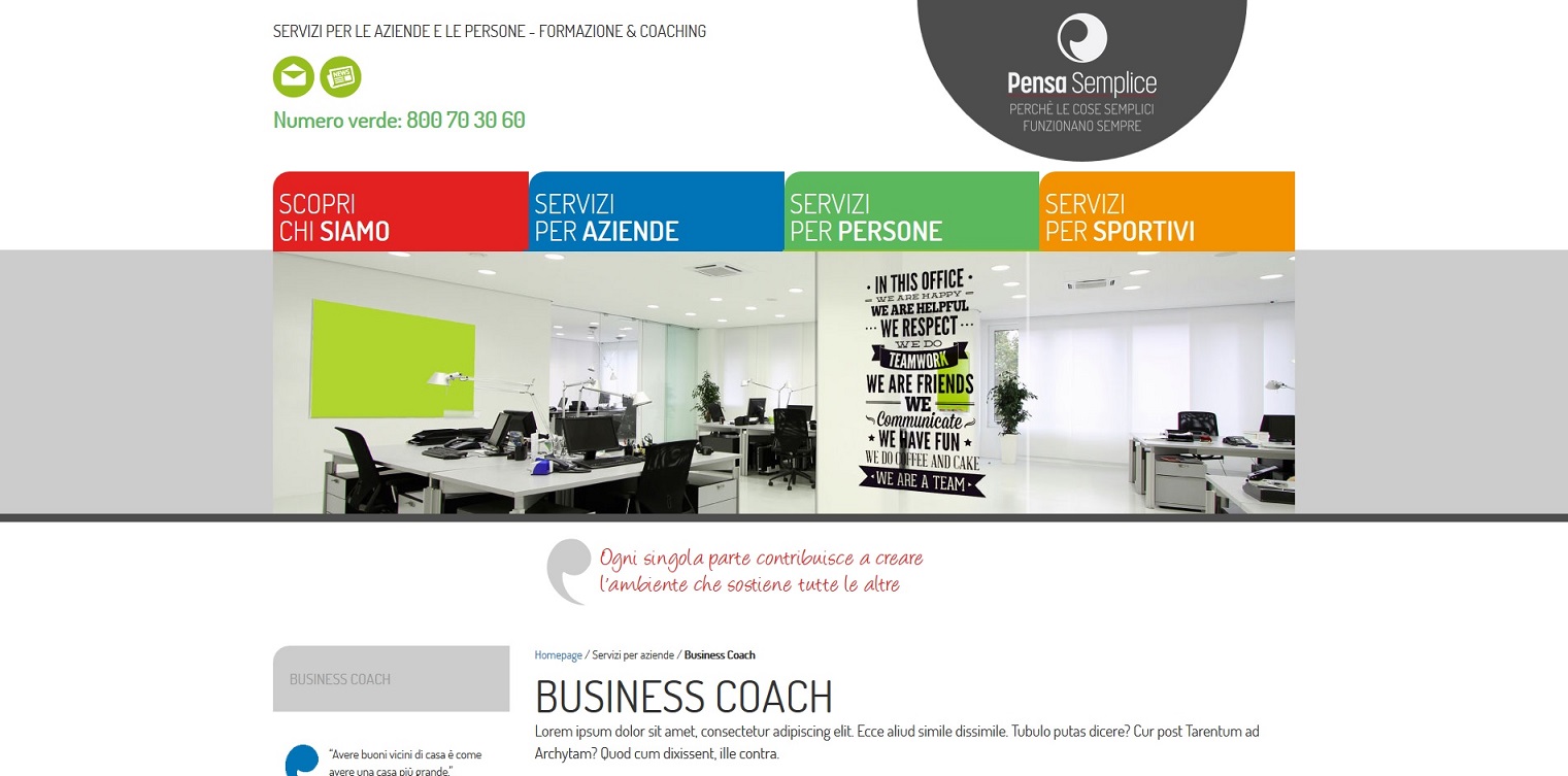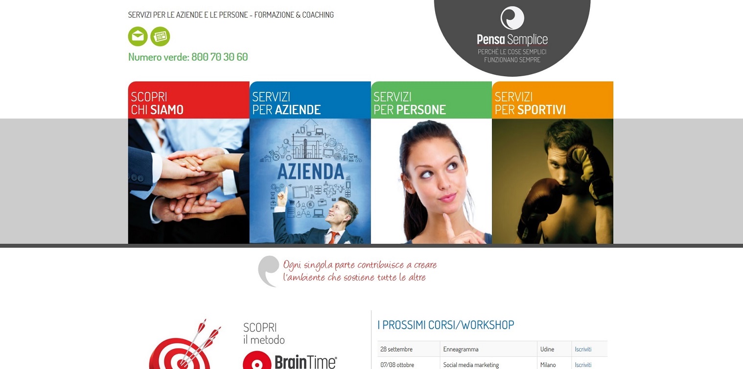 La continua evoluzione di un'azienda frizzante e in continua evoluzione come Pensasemplice, l'ha portata ada vere nuove necessità comuncative. Abbiamo pertanto creato il nuovo sito web su piattaforma Interweb con grafica firmata da Lara Ariganello. I contenuti sono organizzati per target di riferimento e il catalogo corsi ha presenze e rimandi in differenti sezioni per aumentarne la visibilità.